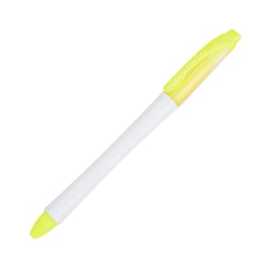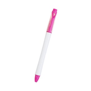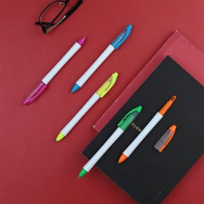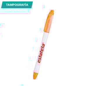 Bolígrafo 2 en 1 con marca textos; barril plástico color blanco, tapa en la parte superior translucida con detalles de color en clip y punta.