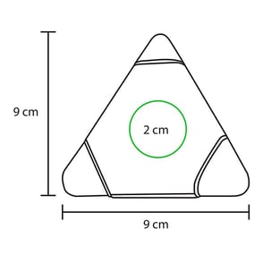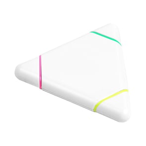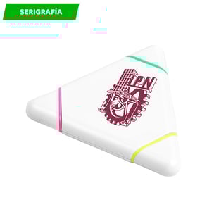 Figura de plástico en forma de triángulo en color blanco con 3 marca textos de colores.