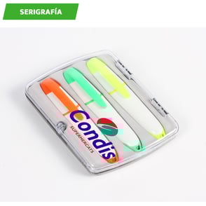 Estuche de plástico con 3 marca textos de colores. Incluye estuche de plástico con sistema de cierre magnético.